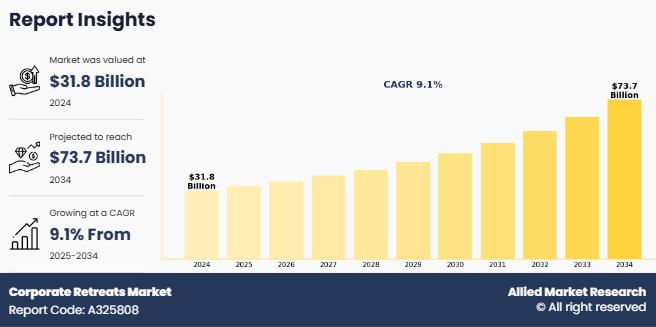 According to a new report published by Allied Market Research, titled, "Corporate Retreats Market," The corporate retreats market size was valued at $31.8 billion in 2024, and is estimated to reach $73.7 billion by 2034, growing at a CAGR of 9.1% from 2025 to 2034.