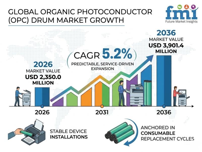 The global organic photoconductor (OPC) drum market is entering a phase of predictable, service-driven expansion, with its value projected to grow from USD 2,350.0 million in 2026 to USD 3,901.4 million by 2036, registering a CAGR of 5.2%. Unlike broader printing hardware segments, growth in this market is anchored in consumable replacement cycles, reinforcing its resilience amid stable device installations.