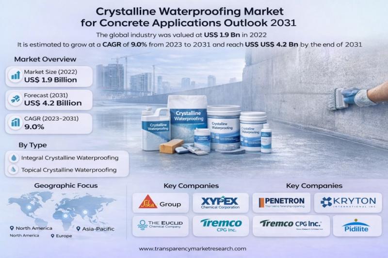 The global crystalline waterproofing market for concrete applications was valued at US$ 1.9 Bn in 2022 and is projected to reach US$ 4.2 Bn by the end of 2031, expanding at a CAGR of 9.0% from 2023 to 2031. The market is witnessing strong growth momentum, fueled by increasing construction activities and the growing demand for durable, waterproof, and sustainable concrete solutions.