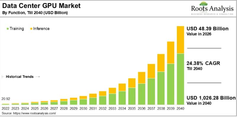 The global data center GPU market, valued at USD 36.59 billion in 2025, will grow to USD 48.39 billion in 2026 and climb to USD 1,026.28 billion by 2040, expanding at a compound annual growth rate of 24.38% over the 2026 to 2040 forecast period. Surging demand for AI training infrastructure, hyperscale cloud buildout, and next-generation scientific computing are collectively pushing GPU-accelerated data centers to the center of enterprise technology spending.To explore the complete findings, request a free sample of the report at https://www.rootsanalysis.com/data-center-gpu-market/request-sample