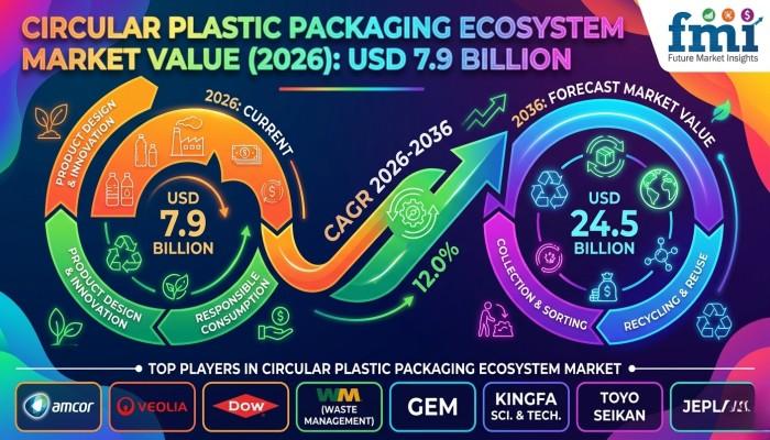 The global Circular Plastic Packaging Ecosystem Market is entering a decade of structural expansion as governments, brand owners, and recycling infrastructure providers align around closed-loop material systems. Industry analysis indicates that spending across the circular plastic packaging ecosystem will reach USD 7.9 billion in 2026 and is projected to rise to USD 24.5 billion by 2036, expanding at a 12.0% CAGR during the forecast period.
