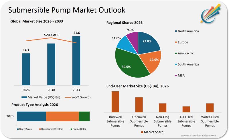 Submersible Pump Market OverviewThe global submersible pump market is positioned for robust expansion, with revenues projected to increase from USD 14.1 billion in 2026 to USD 21.6 billion by 2033, according to Market Minds Advisory. The market's current momentum is underpinned by rising investments in municipal water supply, wastewater management, and agricultural irrigation. Submersible pumps are increasingly favored for their operational efficiency, low maintenance requirements, and ability to function in challenging environments.