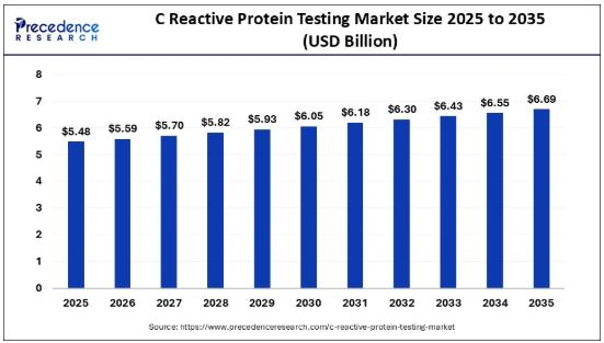 According to Precedence Research, the global C reactive protein testing market size was estimated at USD 5.48 billion in 2025 and is projected to reach around USD 6.69 billion by 2035 with a healthy CAGR of 2.01% from 2026 to 2035. This growth reflects the growing importance of CRP testing in healthcare, particularly for the early detection and management of cardiovascular and inflammatory diseases.