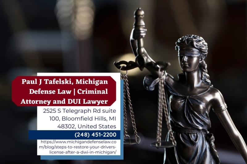 BLOOMFIELD HILLS, MI - Michigan drivers who have had their licenses revoked following an OWI conviction face a detailed, multi-step process before they can legally get back behind the wheel. Michigan license restoration attorney Paul J. Tafelski of Michigan Defense Law (https://www.michigandefenselaw.com/blog/steps-to-restore-your-drivers-license-after-a-dwi-in-michigan/) outlines the key stages of the restoration process, from confirming eligibility to presenting a case at a formal hearing before the Office of Hearings and Administrative Oversight.