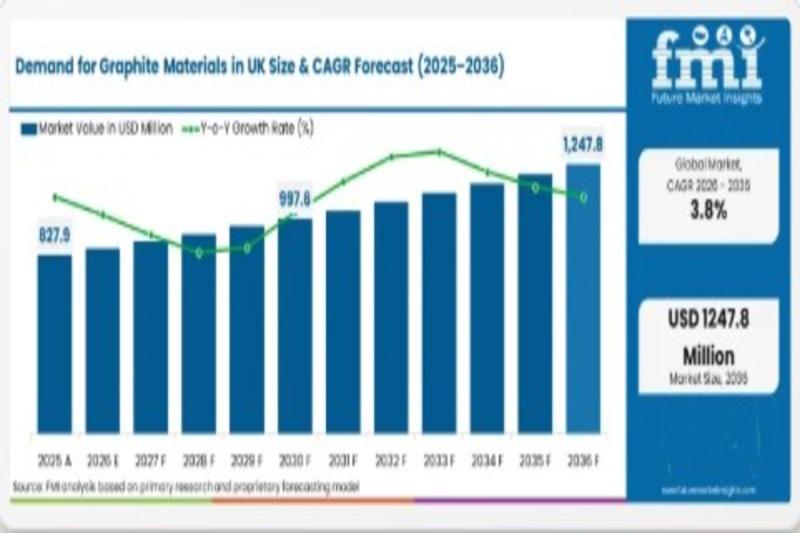 The UK graphite materials market is entering a structurally significant growth phase, driven by electrification policies, supply chain localization, and evolving industrial demand. Valued at USD 859 million in 2026, the market is projected to reach USD 1,248 million by 2036, expanding at a CAGR of 3.8% over the forecast period.