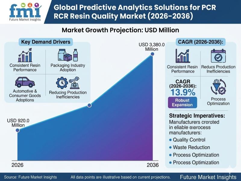 The global Predictive Analytics Solutions for PCR Resin Quality Market is entering a decisive growth phase, projected to expand from USD 920.0 million in 2026 to USD 3,380.0 million by 2036, registering a robust CAGR of 13.9%. As recycled plastics gain mainstream adoption across packaging, automotive, and consumer goods industries, predictive analytics is emerging as a mission-critical layer for ensuring consistent resin performance and reducing costly production inefficiencies.