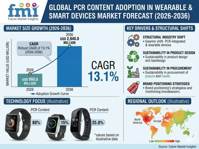The global PCR content adoption in wearable and smart devices market is entering a decisive growth phase, projected to expand from USD 860.0 million in 2026 to USD 2,940.0 million by 2036, registering a robust CAGR of 13.1%. This growth reflects a structural shift in the consumer electronics industry, where sustainability is no longer optional but embedded into product design, procurement strategies, and brand positioning.