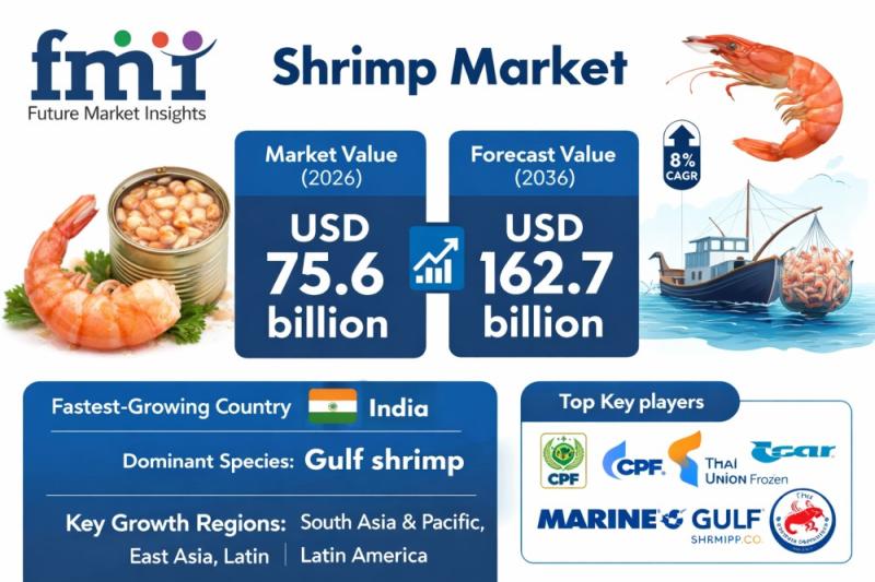 The global shrimp market is entering a strong growth phase, driven by rising consumer demand for high-protein seafood, expanding aquaculture production, and increasing preference for convenient processed shrimp products. Valued at USD 75.6 billion in 2026, the market is projected to reach USD 162.7 billion by 2036, expanding at a CAGR of 8.0% over the forecast period.This more than 2.1x expansion reflects the growing importance of shrimp across retail, foodservice, and ready-to-cook meal applications worldwide.