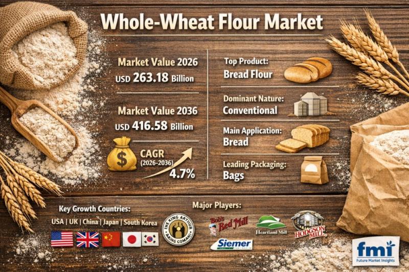 The global whole-wheat flour market is projected to grow from USD 263.18 billion in 2026 to USD 416.58 billion by 2036, registering a CAGR of 4.7% during the forecast period. Rising demand for healthier bakery products, whole grain ingredients, and fiber-rich staple foods is encouraging manufacturers to expand their product portfolios and strengthen supply chains.