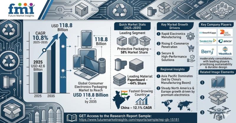 The global consumer electronics packaging market is entering a phase of accelerated expansion, driven by the rapid growth of electronics manufacturing, rising e-commerce penetration, and increasing demand for secure, high-performance packaging solutions. According to industry analysis, the market is projected to grow from USD 42.6 billion in 2025 to approximately USD 118.8 billion by 2035, expanding at a robust compound annual growth rate (CAGR) of 10.8% during the forecast period.Key Market Stats:
