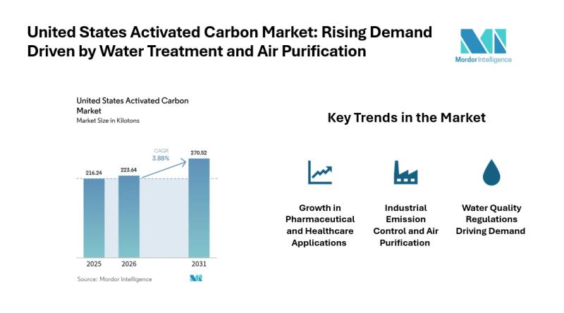 The United States activated carbon market is witnessing steady expansion, supported by tightening environmental regulations and rising demand across water treatment, industrial purification, and pharmaceutical applications. The market is projected to grow from 223.64 kilotons in 2026 to 270.52 kilotons by 2031, registering a CAGR of 3.88% during the forecast period.