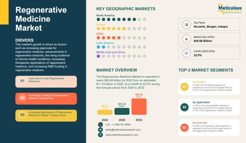 The regenerative medicine market has emerged as one of the most dynamic and rapidly expanding segments within the healthcare industry. Valued at $9.52 billion in 2024, the market is projected to reach $45.66 billion by 2032, with an estimated $11.33 billion in 2025. This growth represents a robust compound annual growth rate of 22.0% from 2025 to 2032. The expansion of this market is fueled by increasing regulatory approvals, advancements…