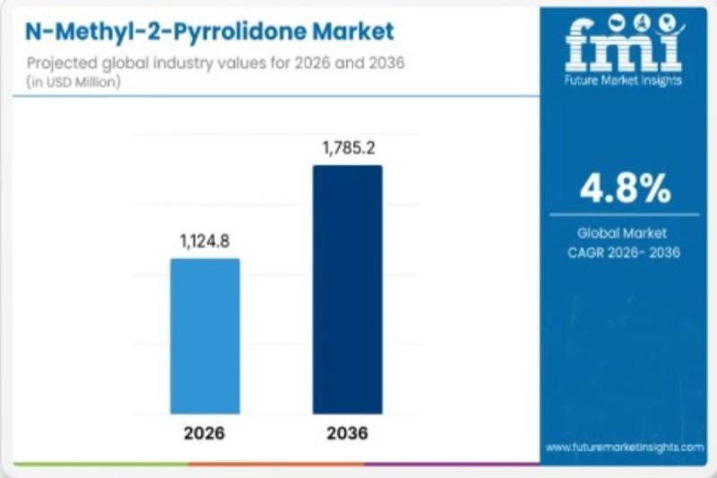 The global N-Methyl-2-Pyrrolidone (NMP) market is entering a new phase of strategic growth, driven by accelerating investments in electric vehicles (EVs), semiconductor manufacturing, and advanced materials. According to the latest industry analysis, the market is projected to grow from USD 1,124.8 million in 2026 to USD 1,785.2 million by 2036, registering a compound annual growth rate (CAGR) of 4.8% over the forecast period.This steady expansion underscores the critical role of NMP as a high-performance solvent across industries where precision, purity, and efficiency are non-negotiable.