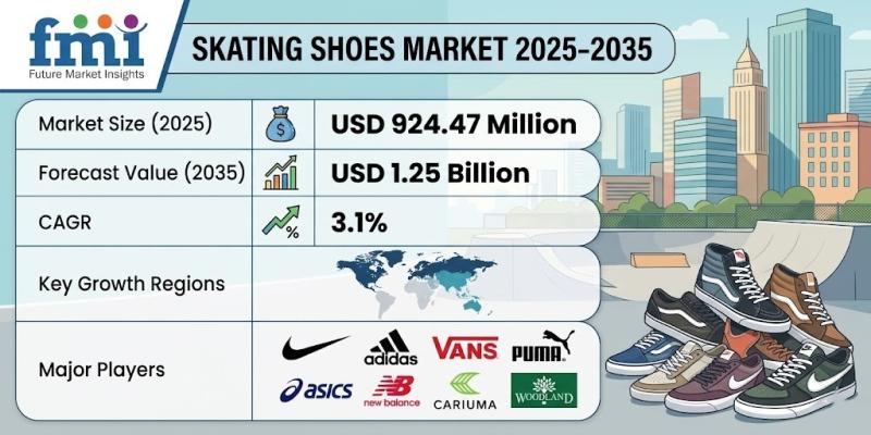 The global skating shoes market is poised for consistent expansion, projected to grow from USD 924.47 million in 2025 to USD 1.25 billion by 2035, registering a compound annual growth rate (CAGR) of 3.1%. Market growth is being driven by increasing youth participation in skating sports, evolving lifestyle trends centered on fitness, and the growing influence of street culture and Olympic recognition of skateboarding.