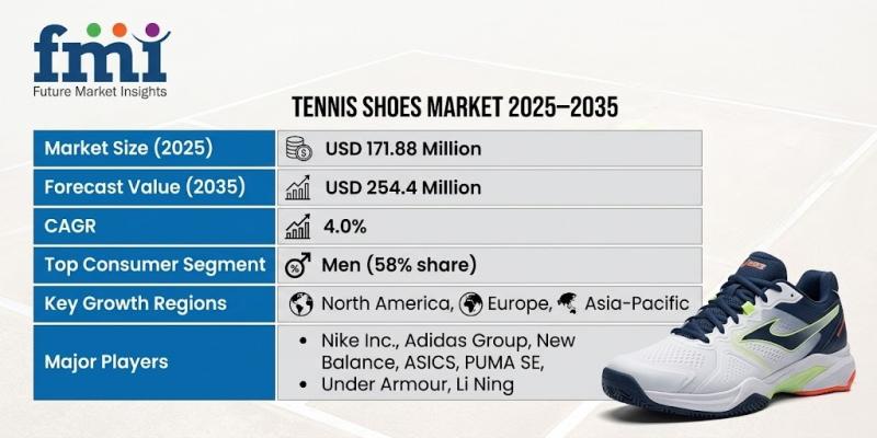 The global tennis shoes market is witnessing consistent expansion, driven by rising participation in tennis and racquet sports, growing fitness awareness, and the strong influence of athleisure trends. The market is projected to grow from USD 171.88 million in 2025 to USD 254.4 million by 2035, registering a CAGR of 4.0%.