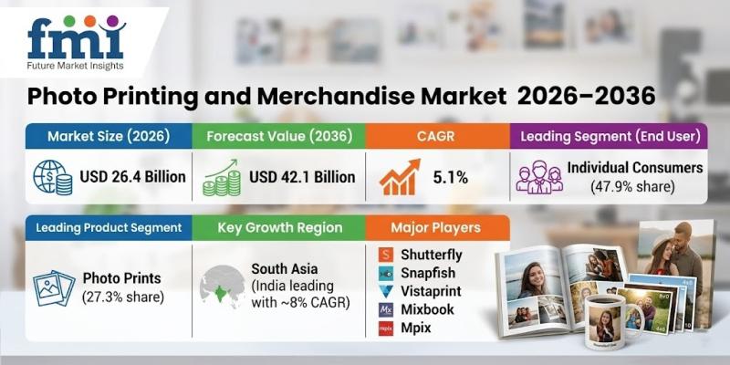 The global photo printing and merchandise market is witnessing steady expansion, projected to grow from USD 26.4 billion in 2026 to approximately USD 42.1 billion by 2036, registering a CAGR of 5.1%. Growth in this market is being driven by increasing consumer demand for personalized products, rising smartphone photography, and the rapid expansion of e-commerce platforms.