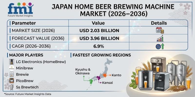 The demand for home beer brewing machines in Japan is experiencing steady growth, projected to expand from USD 2.03 billion in 2026 to approximately USD 3.96 billion by 2036, registering a CAGR of 6.9%. This growth is fueled by the rapid expansion of craft beer culture, evolving consumer preferences toward personalized beverages, and increasing adoption of experiential home appliances.