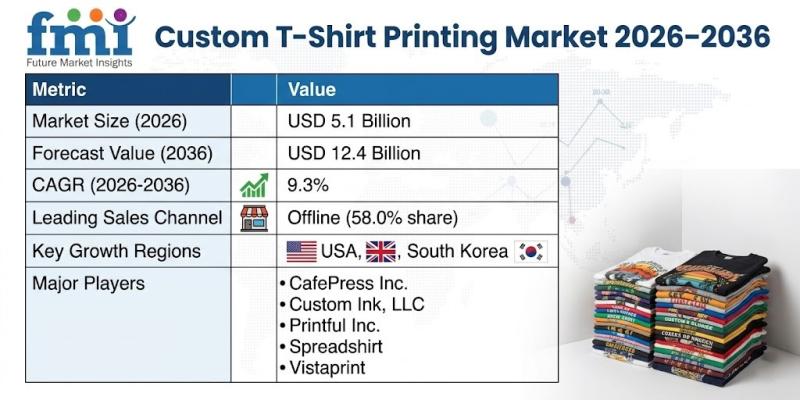 The global custom t-shirt printing market is witnessing robust expansion, projected to grow from USD 5.1 billion in 2026 to approximately USD 12.4 billion by 2036, registering a CAGR of 9.3%. Growth in this market is being driven by increasing demand for personalized apparel, expansion of e-commerce merchandising, and advancements in print-on-demand technologies.As businesses and consumers increasingly seek customized, high-quality, and fast-turnaround apparel solutions, manufacturers and service providers are focusing on workflow automation, production standardization, and scalable fulfillment models. The integration of digital printing technologies, hybrid production systems, and eco-friendly inks is expected to shape the future of the industry.