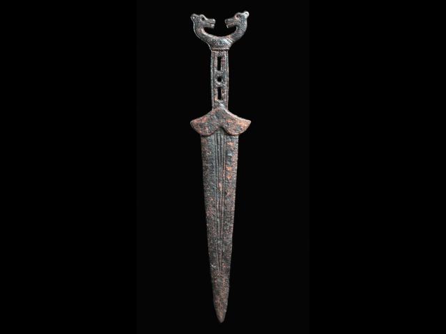 A Viking-period iron dagger from Eastern Steppes in southern Europe, circa 9th-11th century A.D., 153⁄4 inches in length, nearly doubled the $1,500 high estimate by selling for $2,600. The long, forged iron dagger, having a long, tapered blade with blood ridges on both sides, featured a flared hilt, openwork hand grip, and an overall good rusted black surface patina.