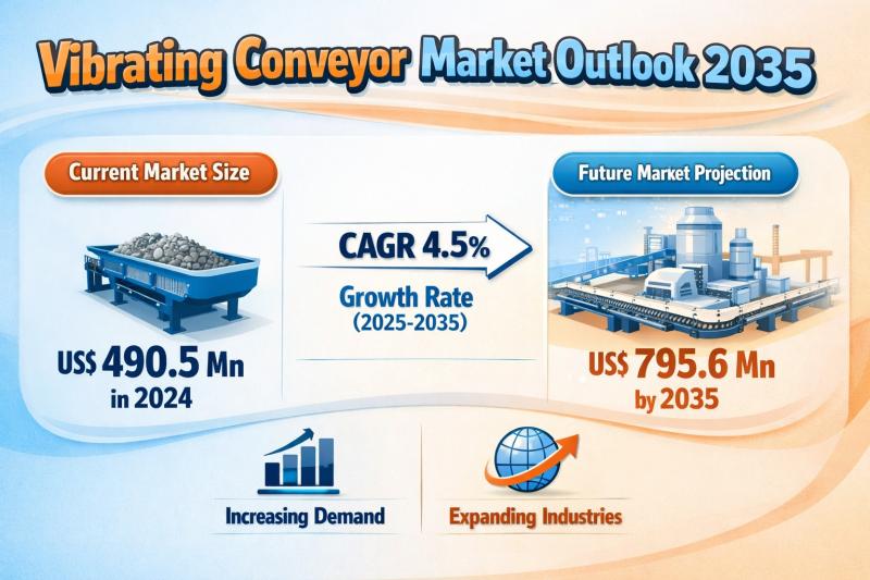 The global vibrating conveyor market is poised for steady growth over the next decade, with its valuation projected to rise from US$ 490.5 Mn in 2024 to US$ 795.6 Mn by 2035, expanding at a compound annual growth rate (CAGR) of 4.5% from 2025 to 2035. This consistent growth trajectory reflects increasing adoption across multiple industries, including food & beverage, pharmaceuticals, mining, and automotive manufacturing.