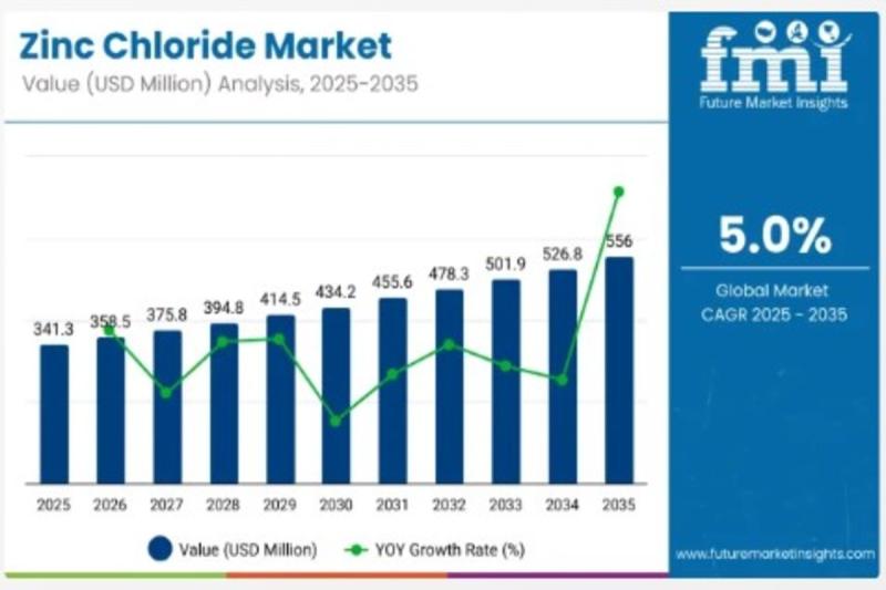The global zinc chloride market is entering a sustained growth phase, with projections indicating an increase from USD 341.3 million in 2025 to USD 556 million by 2035, registering a compound annual growth rate (CAGR) of 5.0%. The market's upward trajectory reflects expanding industrial applications, technological innovation, and tightening environmental regulations that are reshaping chemical consumption patterns worldwide.Zinc chloride, known for its hygroscopic and highly soluble properties, has become indispensable across sectors including metallurgy, pharmaceuticals, electronics, and water treatment. Its role as a catalyst, electrolyte, and flux agent continues to anchor demand across both mature and emerging industries.