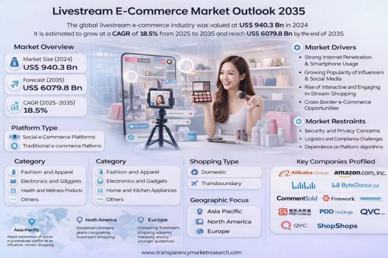 The global livestream e-commerce market was valued at US$ 940.3 billion in 2024 and is projected to reach US$ 6,079.8 billion by 2035, expanding at a CAGR of 18.5% from 2025 to 2035. The market is experiencing rapid growth driven by increasing consumer engagement, the integration of entertainment with online shopping, and the widespread adoption of social commerce platforms.Access key findings and insights from our Report in this sample - https://www.transparencymarketresearch.com/sample/sample.php?flag=S&rep_id=86439