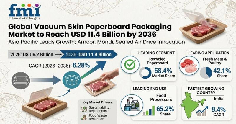 The global vacuum skin paperboard packaging market is entering a high-growth phase as food processors and retailers accelerate the shift from plastic trays to fiber-based vacuum skin solutions. According to industry analysis by Future Market Insights, the market is projected to grow from USD 6.2 billion in 2026 to approximately USD 11.4 billion by 2036, expanding at a compound annual growth rate (CAGR) of 6.28% during the forecast period.