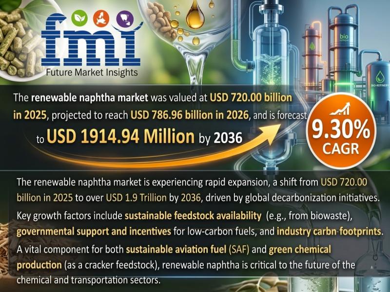 The global Renewable Naphtha Market is entering a high-growth phase, fueled by decarbonization mandates and rising demand for sustainable petrochemical inputs. According to recent analysis, the market was valued at USD 720.00 billion in 2025 and is projected to reach USD 786.96 billion in 2026, expanding to USD 1,914.94 billion by 2036, at a robust CAGR of 9.30% during the forecast period.