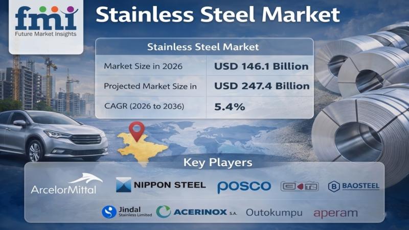 The global stainless steel market is set for sustained expansion, projected to grow from USD 146.1 billion in 2026 to USD 247.4 billion by 2036, registering a CAGR of 5.4%.