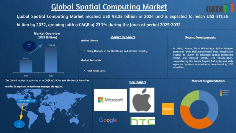 Global Spatial Computing Market reached US$ 93.25 billion in 2024 and is expected to reach US$ 511.55 billion by 2032, growing with a CAGR of 23.7% during the forecast period 2025-2032.
