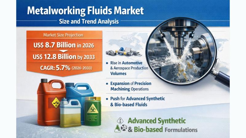 The global Metalworking Fluids Market is witnessing steady growth as industrialization, precision manufacturing, and technological advancements continue to reshape modern production ecosystems. According to the latest study by Persistence Market Research, the market is expected to be valued at US$ 8.7 billion in 2026 and projected to reach US$ 12.8 billion by 2033, growing at a CAGR of 5.7% during the forecast period. Increasing demand for high-performance machining processes, along…