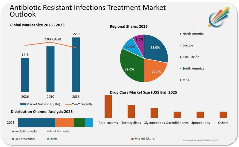 The global Antibiotic Resistant Infections Treatment Market is positioned at a critical juncture, with a market value of USD 14.2 billion in 2026 and projected to reach USD 22.9 billion by 2033, according to Market Minds Advisory. This growth trajectory is underpinned by escalating incidences of multidrug-resistant bacterial infections, which are outpacing the effectiveness of conventional antibiotics. The market is witnessing increased investment in advanced…