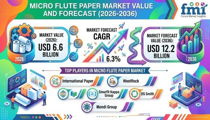 The global micro flute paper market is entering a strong growth phase, driven by the rapid expansion of e-commerce, retail packaging innovation, and increasing demand for lightweight yet durable packaging materials. The market is valued at USD 6.6 billion in 2026 and is projected to reach USD 12.2 billion by 2036, expanding at a CAGR of 6.3% during the forecast period.