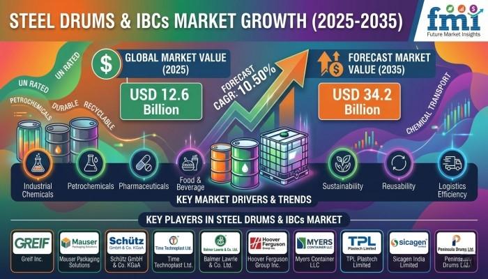 The global Steel Drums & IBCs Market is entering a major growth phase, driven by rising demand for safe bulk liquid transportation, expanding chemical production, and increasing regulatory compliance requirements across global logistics and industrial supply chains. According to new industry analysis, the market is projected to grow from USD 12.6 billion in 2025 to approximately USD 34.2 billion by 2035, reflecting a CAGR of 10.50% and an absolute opportunity of USD 21.6 billion over the forecast period.This growth reflects a structural shift in industrial packaging, where containment safety, regulatory compliance, and long-distance logistics reliability are becoming critical decision factors for chemical manufacturers, petroleum companies, and industrial liquid handlers worldwide.
