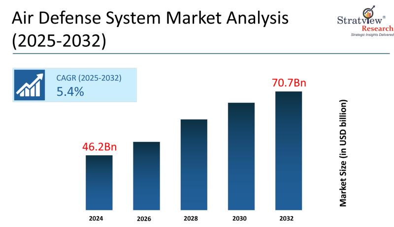 The air defense system market refers to the global industry focused on technologies that detect, track, and neutralize airborne threats such as missiles, aircraft, drones, and rockets. According to Stratview Research, the market was valued at USD 46.2 billion in 2024 and is projected to reach USD 70.7 billion by 2032, growing at a CAGR of 5.4% during the forecast period of 2025-2032. The most important growth driver is the…