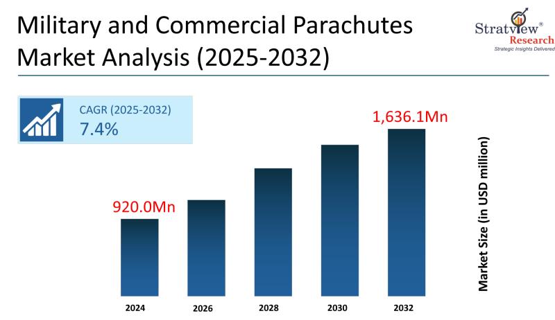 The military and commercial parachutes market refers to the global industry involved in the design, manufacturing, and supply of parachute systems used for defense operations and civilian applications such as recreational skydiving and emergency deployment. According to Stratview Research, the market was valued at USD 920.0 million in 2024 and is projected to reach USD 1,636.1 million by 2032, registering a CAGR of 7.4% during the forecast period of 2025-2032.…