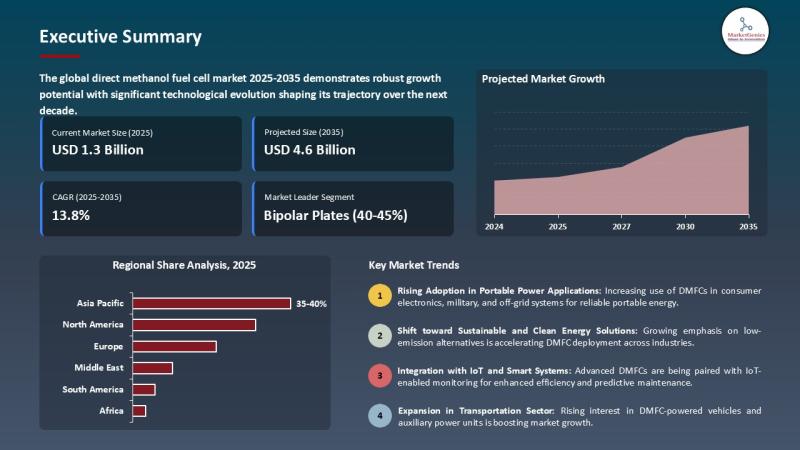 Wilmington, DE, USA, 2nd April 2026 - According to MarketGenics, the global direct methanol fuel cell market is valued at USD 1.3 billion in 2025 and is projected to reach approximately USD 4.6 billion by 2035, expanding at a CAGR of 13.8% during the forecast period (2025-2035). The market is being shaped by the increasing demand for clean energy solutions, portable power systems, and high-efficiency fuel technologies across transportation, defense,…