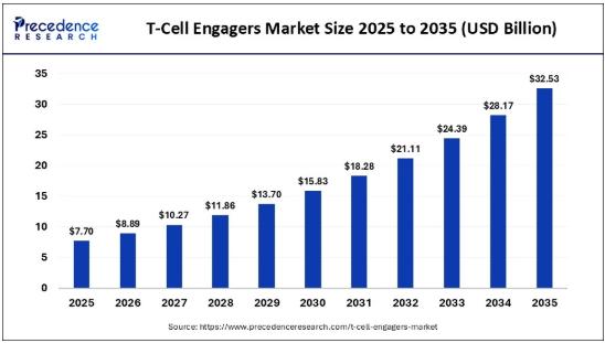 According to Precedence Research, the global T-cell engagers market size will surge from USD 7.70 billion in 2025 to approximately USD 32.53 billion by 2035 with a CAGR of 15.50% from 2026 to 2035. This growth is driven by the rapid advancements in immunotherapy, including bispecific and multispecific T-cell engagers, which are revolutionizing cancer and autoimmune disease treatment.