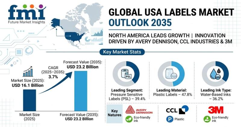 The USA labels market is entering a phase of steady and innovation-driven growth as industries increasingly rely on advanced labeling solutions for product identification, branding, and regulatory compliance. According to industry analysis, the market is projected to grow from USD 16.1 billion in 2025 to approximately USD 23.2 billion by 2035, expanding at a compound annual growth rate (CAGR) of 3.7% during the forecast period.