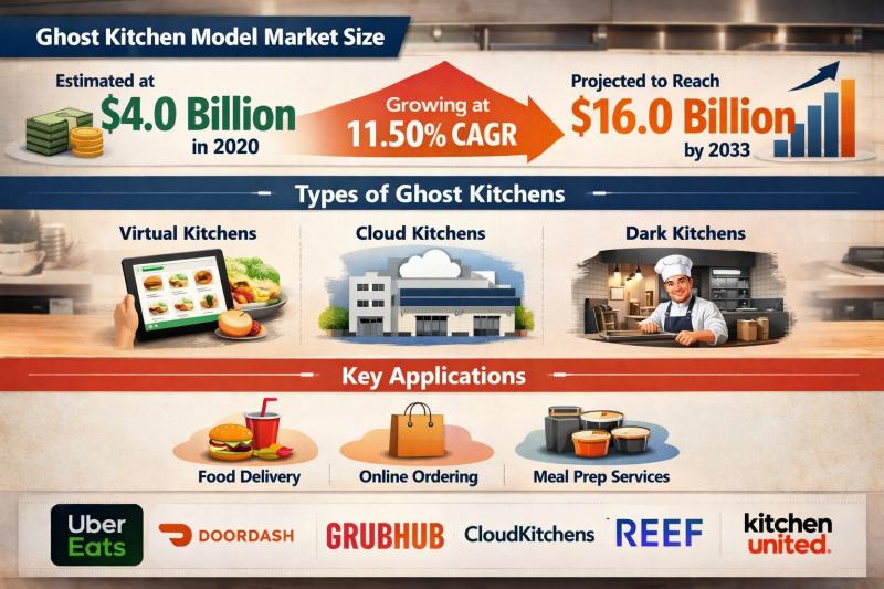 HTF MI just released the Global Ghost Kitchen Model Market Study, a comprehensive analysis of the market that spans more than 143+ pages and describes the product and industry scope as well as the market prognosis and status for 2020-2033. The marketization process is being accelerated by the market study's segmentation by important regions. The market is currently expanding its reach.Major companies profiled in Ghost Kitchen Model Market are: