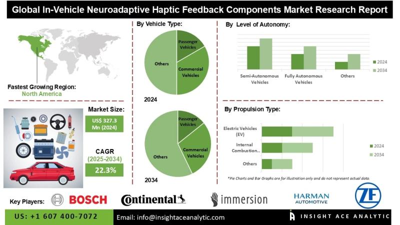 InsightAce Analytic Pvt. Ltd. announces the release of a market assessment report on the "Global In-vehicle Neuroadaptive Haptic Feedback Components Market Size, Share & Trends Analysis Report By Product Type (Steering Wheel Feedback System, Touchscreen Haptics, and Others [Seat-based Modules, Pedal/Gear Feedback]), Component (Neuroadaptive Sensors, Haptic Actuators, Control Electronics, and Others [Software, HMI]), Vehicle Type (Passenger Vehicles and Commercial Vehicles [Light Commercial Vehicles (LCV), Heavy Commercial Vehicles (HCV)]), Propulsion Type…