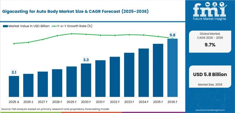 The global gigacasting for auto body market is entering a transformative growth phase, driven by the automotive industry's rapid shift toward electric vehicle (EV) production and next-generation manufacturing technologies. Valued at USD 2.1 billion in 2025, the market is projected to reach USD 2.3 billion in 2026 and expand significantly to USD 5.8 billion by 2036, registering a robust compound annual growth rate (CAGR) of 9.7% during the forecast period.