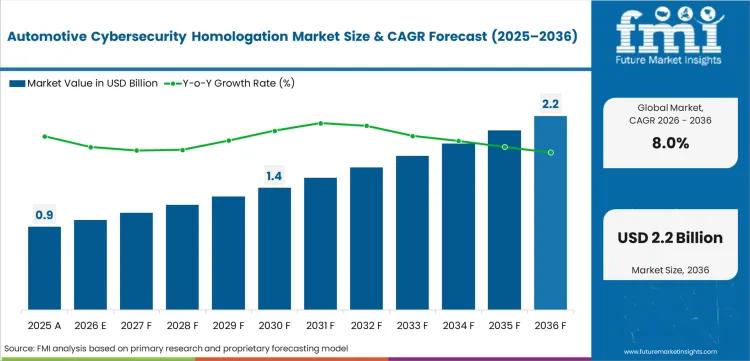 The global automotive cybersecurity homologation market is undergoing a structural transformation as digitalization in vehicle architecture accelerates and regulatory oversight intensifies. The market, valued at USD 0.9 billion in 2025, is projected to reach USD 1.0 billion in 2026 and expand to USD 2.1 billion by 2036, reflecting a steady compound annual growth rate (CAGR) of 8.0% over the forecast period.This expansion is being driven by the rapid integration of software-defined systems within vehicles, where cybersecurity validation has transitioned from a supplementary requirement to a mandatory component of regulatory approval. As automotive platforms evolve into complex digital ecosystems, homologation services are emerging as a critical enabler of compliance, safety, and market access.