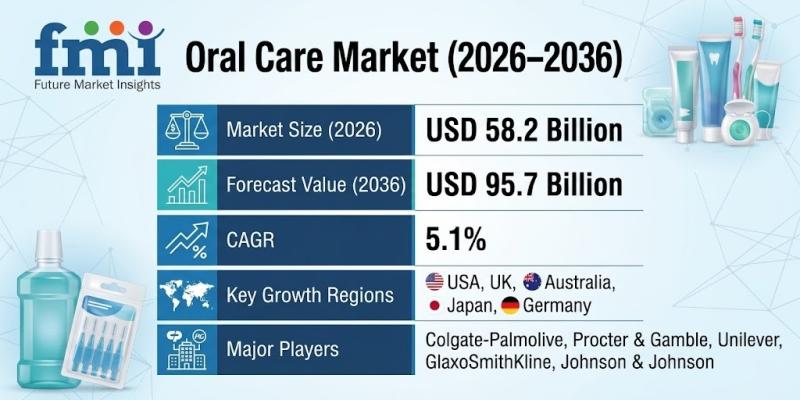 The demand for oral care products is witnessing steady expansion, with the market projected to grow from USD 58.2 billion in 2026 to approximately USD 95.7 billion by 2036, registering a CAGR of 5.1%. This growth is driven by consistent daily-use demand, structured product replenishment cycles, and ongoing premiumisation across core categories such as toothpaste and whitening solutions.