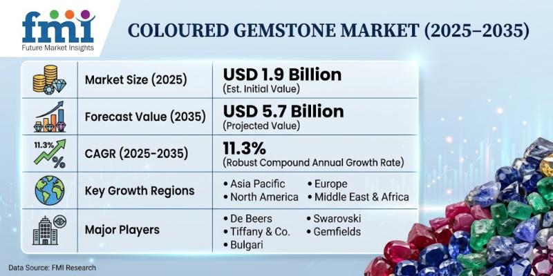 The global coloured gemstone market is witnessing strong momentum and is projected to grow from USD 1.9 billion in 2025 to approximately USD 5.7 billion by 2035, registering a CAGR of 11.3%. This significant growth is driven by rising consumer inclination toward luxury and bespoke jewelry, increasing disposable incomes, and growing awareness of coloured gemstones as both aesthetic and investment assets.
