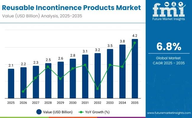 The global reusable incontinence products market is witnessing steady growth, projected to expand from USD 2.1 Billion in 2025 to approximately USD 4.2 Billion by 2035, registering a CAGR of 6.8%. This growth is driven by increasing demand for sustainable hygiene solutions, rising awareness of incontinence care, and the growing need for cost-effective long-term alternatives.