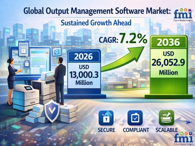 The global Output Management Software Market is entering a sustained growth phase, projected to expand from USD 13,000.3 million in 2026 to USD 26,052.9 million by 2036, registering a steady CAGR of 7.2%. This growth reflects the increasing need for secure, compliant, and scalable document output systems as enterprises navigate complex digital ecosystems and regulatory environments.