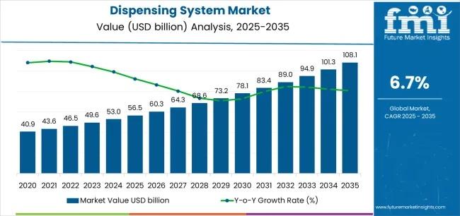 The global Dispensing System Market is set for robust expansion, projected to grow from USD 56.5 billion in 2025 to USD 108.1 billion by 2035, registering a steady CAGR of 6.7%. This growth trajectory reflects increasing adoption of precision dispensing technologies across electronics, automotive, and pharmaceutical industries, where accuracy, repeatability, and efficiency are becoming critical operational requirements.