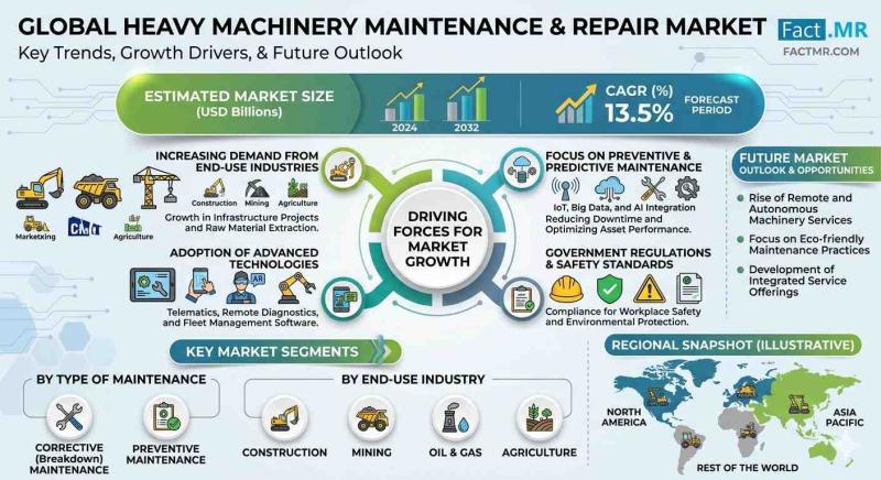As global infrastructure investments hit record highs, a new report reveals that the Heavy Machinery Maintenance & Repair Market is no longer just a "back-office" expense-it has become a strategic pivot point for industrial survival. Valued at US$ 182.9 billion in 2022, the market is on a high-velocity trajectory to reach US$ 284 billion by 2032, expanding at a steady 4.5% CAGR.