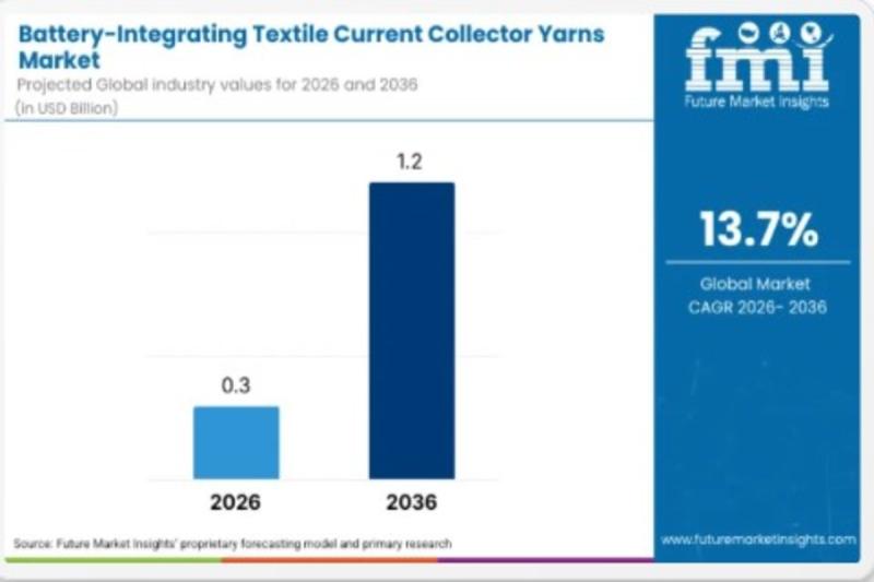 The global battery-integrating textile current collector yarns market is entering a decisive growth phase, projected to expand from USD 0.3 billion in 2026 to USD 1.2 billion by 2036, registering a robust CAGR of 13.7%. This acceleration reflects a critical transition from experimental smart garments to industrial-grade textile energy systems built on reliability, compliance, and scalable material science.